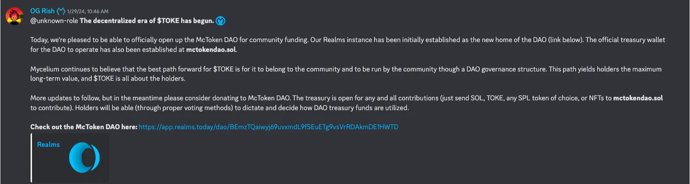 January 29th 2024, a momentous day for all holders would go down in history for all the wrong reasons. There were two important announcements that day. First off, Mycelium officially separated itself from $TOKE, ushering in a new era, the “Decentralized Era” had begun. Finally, $TOKE was seemingly free from the mycelial roots that birthed it.