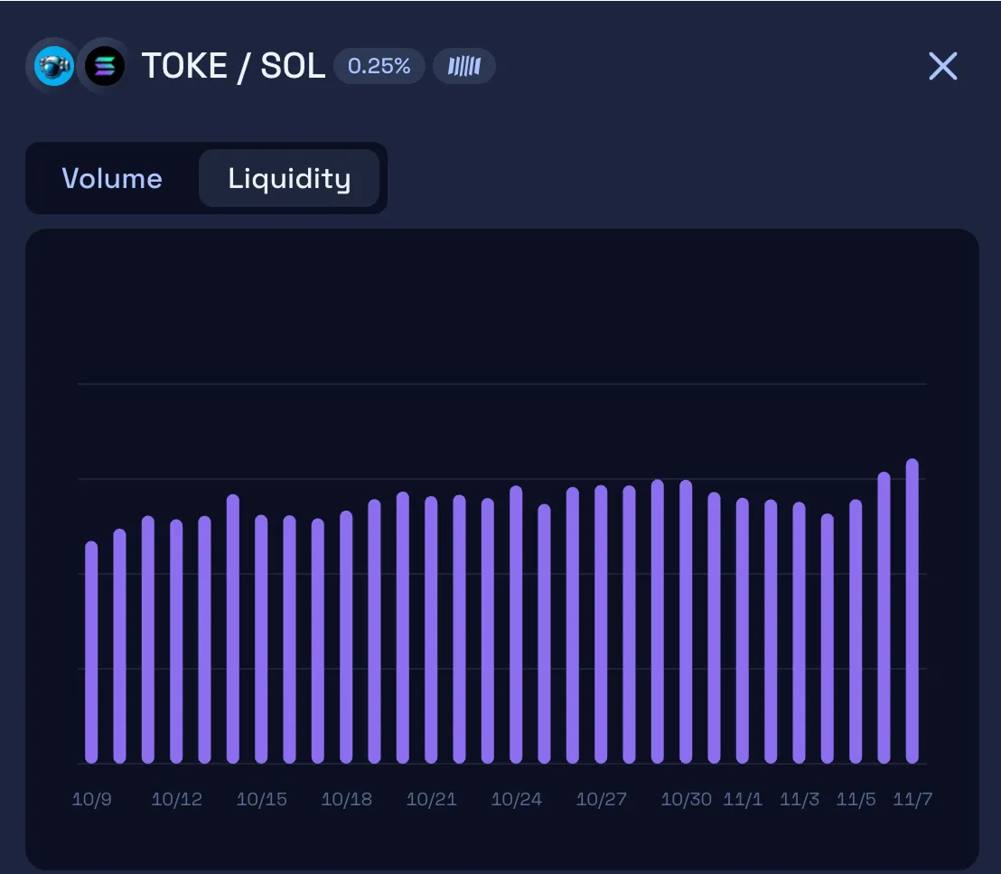 After all the festivities had died down from $TOKE festival, I began to notice something. $TOKE had already began it’s infestation into the Solana ecosystem. Approximately 3 months before the Great McVote and up until about 3 months following, $TOKE had began becoming one of the most liquid tokens on Solana. It’s roots stretched deep, mirroring it’s mycelial creator. It had deep liquidity pools that were unmatched by many other memecoins. At the time of writing, 32 different liquidity pools have been filled to the brim with $TOKE. They can be viewed here and here.