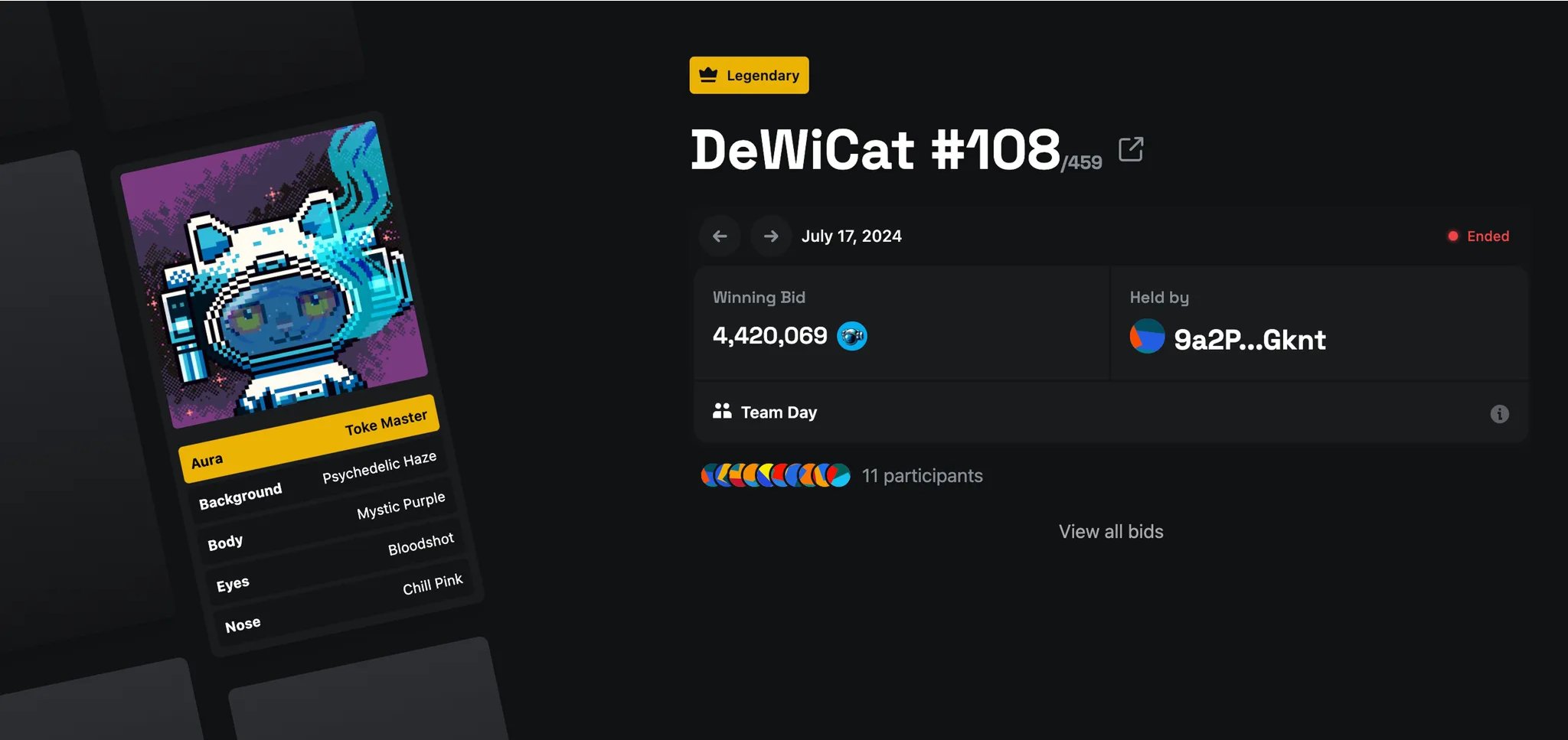 This stoned kitty would become one of the few legendaries in the entire collect and was auctioned off over 24 hours and was sold for a whopping 4,420,69 $TOKE. Discord user awarshauer was the lucky bidder who got to take home this legendary cat. This has been one of the most expensive DeWi Cats sold to date, and 20% of the proceeds went to the Toke-Up DAO’s new treasury. .