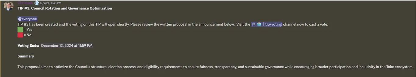 On December 9th 2024, TIP #3 was proposed in the Discord. Proposing a mandated council rotation and governance optimization. Seemingly taking a page out of D.O.G.E.’s book, the idea was to optimize The Counsel’s efforts to promote fairness, transparency and sustainability. This proposal would introduce 1-year terms for council members with quarterly elections to fill 2 seats at a time. This also enforces new eligibility requirement, must be holding in between 50,000-100,000 $TOKE, anyone holding the required amount may run without approval. (Note: On December 13th, 2024 TIP #3 passed successfully.)