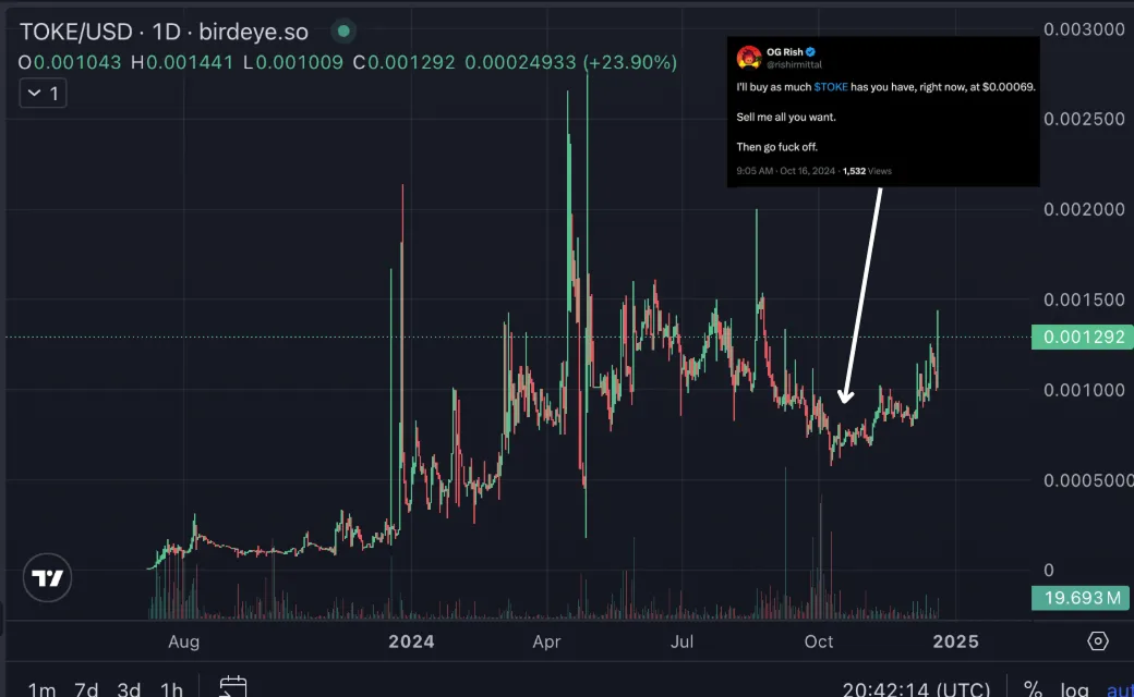 One piece of this puzzle remains constant, that is OG Rish. This faceless figure, acting as both the inertia and the invisible hand, seems to be the glue that holds everything together. On October 16th 2024, he took a page out of SBF’s book by tweeting “I’ll buy as much $TOKE has you have, right now at $0.00069”. He managed to call the bottom, and the McWhales soon followed sort. Since this tweet, we’ve seen more and more green. His loyalty also poses many questions: Why is he yet to give up on this project? Is he the cult leader? What’s on the horizon? Something big must be planned, and people seemingly want to be apart of it. All I know for sure is, if you’re keeping an eye on TOKE, make sure to keep an eye on this unsubstantiated figure head.