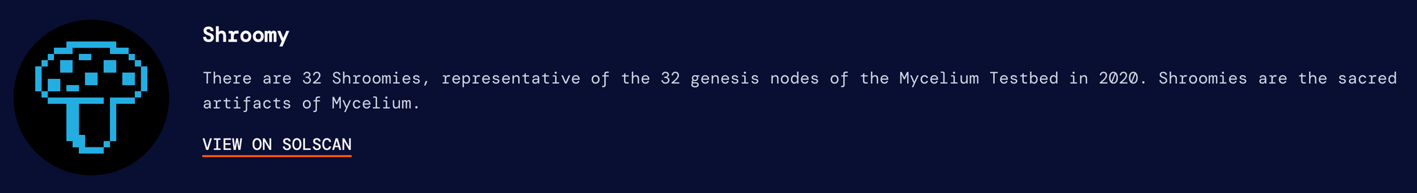 Fast forward to 2022, the network had developed and its roots had grown. The mushroom fueled ecosystem now spanned over 1600 square miles, it’s roots deep and long. Helium, one of the most integral pieces of the network decides to pivot to the Solana blockchain. As any adaptive fungal network does, it responds to change quickly and follows suit. To commemorate the migration and in an attempt to onboard it’s users the team came up with an idea. The Shroomy NFT, was given to the first 32 genesis nodes of the Mycelium Testbed which would serve as Mycelium’s first on-chain foot print.