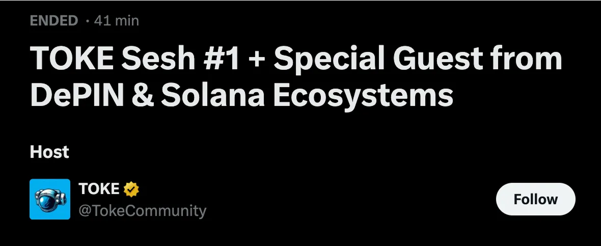 On July 2nd 2024, Christian Goff hosted the first TOKE Sesh. This would become a weekly staple for the community and feature many prominent guests, such as the founders of Entropy, Unleashing DePIN, DePIN Pulse, Suburban Crypto, Erwin Schrödinger (EWN Token on Solana), Who Loves Burrito, Mycelium as well as many prominent holders and McWhales such as; Pudgybearwhale, Mr. Node, Sam W, HeliumInstalGuy, Random Dude on the Internet Tyler Frost. These calls would become a weekly occurrence and remain the best place for the beloved alpha we all crave. These calls are hosted by Pulse, not the TOKE team and that goes to show the strength of the ever growing community.