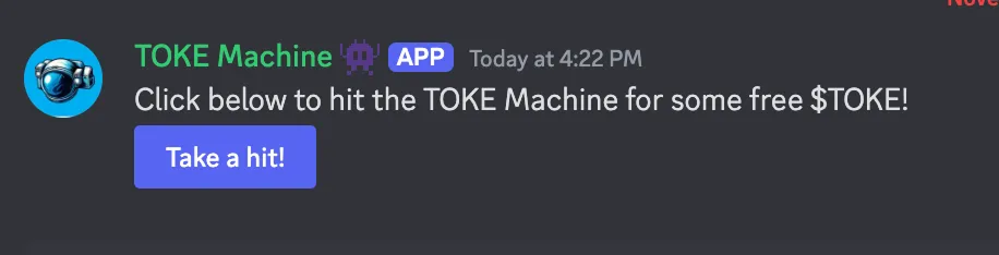 On August 20th 2024, the Toke Machine would be rehoused to toke-up channel within the discord as it transitioned into V2. This new and improved dispensary was loaded with 1 million $TOKE and gave out 1 $TOKE per hit every 24 hours, with the 24 hour timer being unique to each toker. The logic behind this is whether you want to wake and bake or take a hit before you sleep, you are free to toke-up as you choose. This approach is very unique, the focus has shifted from unification to distribution, there is no gate to becoming a toke holder, all you need to do is get you some toke here!